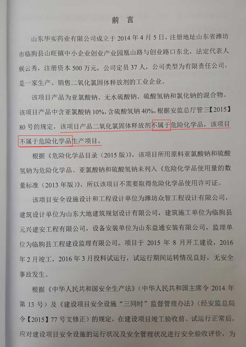 根據(jù)《中華人民共和國(guó)安全生產(chǎn)法》(中華人民共和國(guó)主席令2014年第13號(hào))及《建設(shè)項(xiàng)目安全設(shè)施“三同時(shí)”監(jiān)督管理辦法》(經(jīng)安監(jiān)總局令【2015】77號(hào)文修正)的規(guī)定,在建設(shè)項(xiàng)目竣工驗(yàn)收前、試運(yùn)行正常后,應(yīng)對(duì)建設(shè)項(xiàng)目安全設(shè)施的運(yùn)行狀況及安全管理狀況進(jìn)行安全驗(yàn)收評(píng)價(jià),為安全驗(yàn)收依據(jù),為此,山東華實(shí)藥業(yè)有限公司委托濰坊瑞泰安全技術(shù)咨詢有限公司司對(duì)1000t/a二氧化氯消毒劑項(xiàng)目進(jìn)行安全驗(yàn)收評(píng)價(jià)。