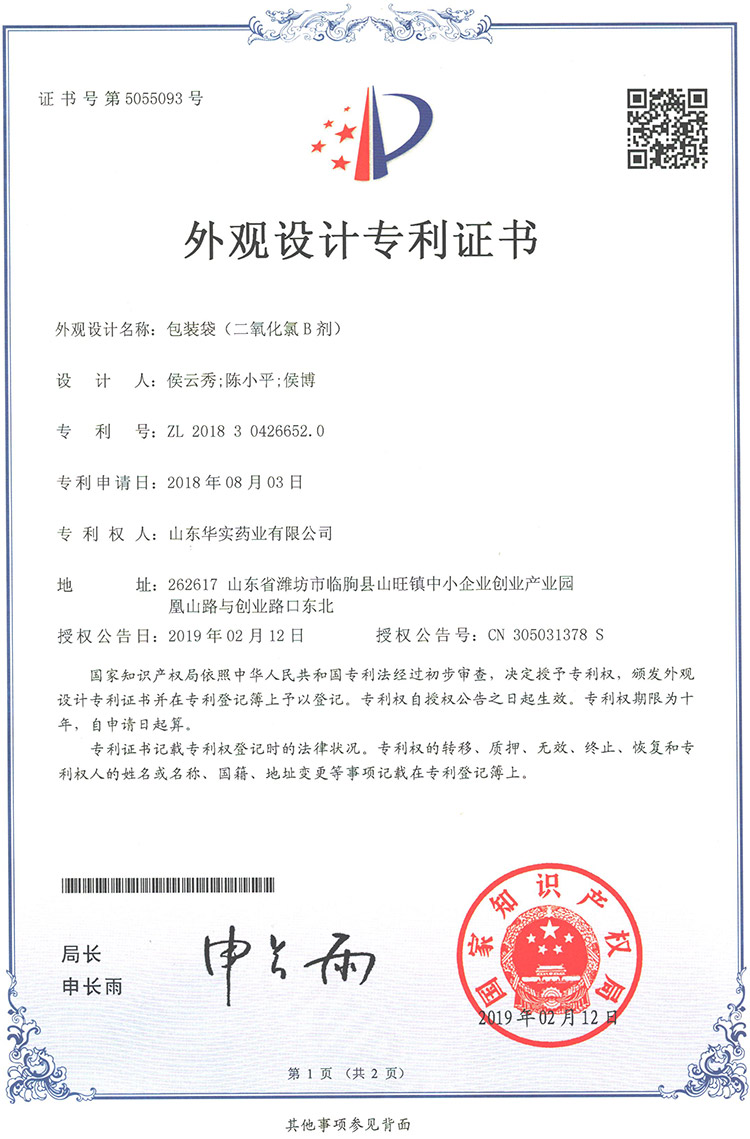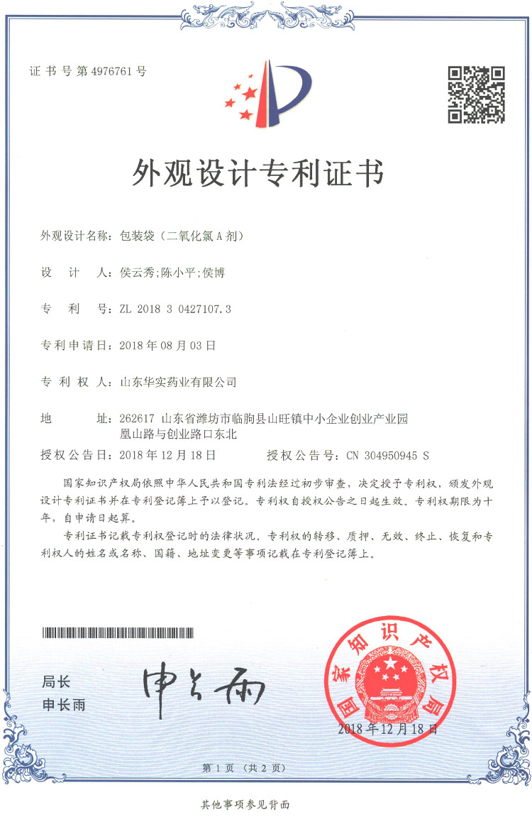 5 2019/2/12 包裝袋(二氧化氯B劑) CN201830426652 CN305031378S 外觀專利