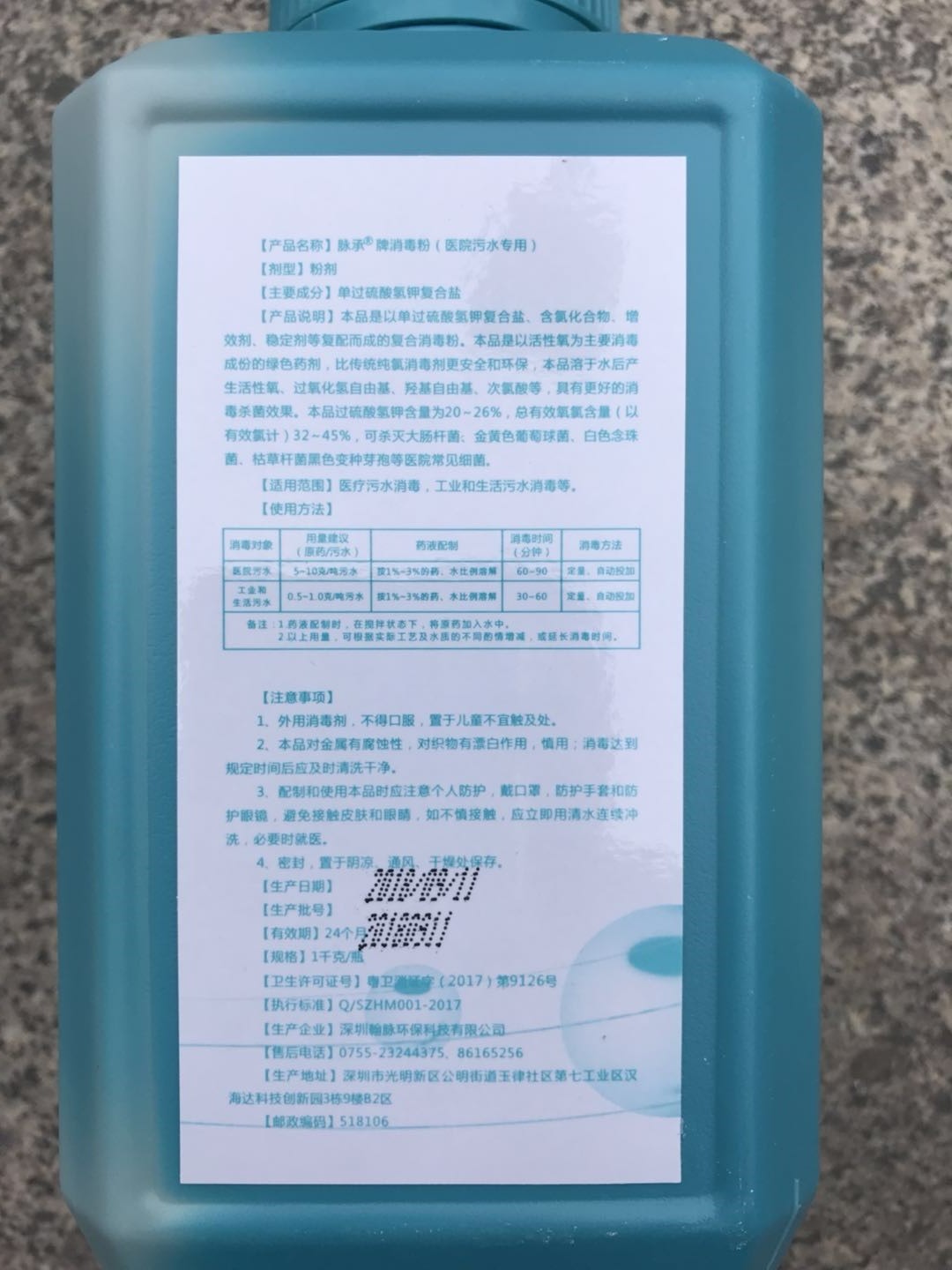 1 脈承牌消毒粉 脈承牌 1千克/瓶 870 脈承牌消毒粉(醫院污水專用),粉劑,主要成分:單過硫酸氫鉀復合鹽