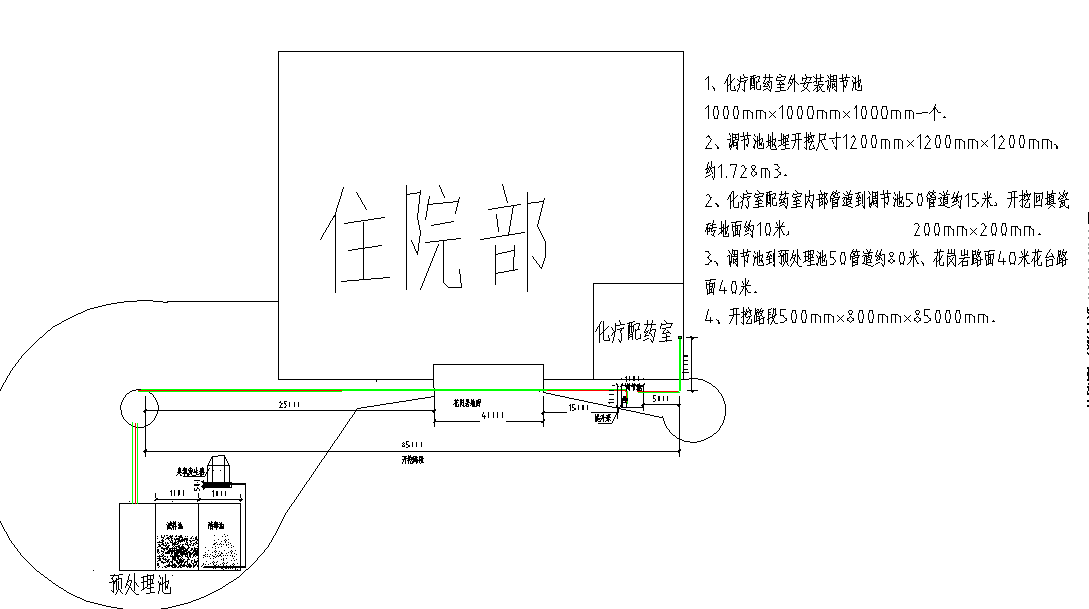 ①化療科配藥室污水原未進(jìn)行處理,現(xiàn)需從科室內(nèi)排水處開挖回填地面瓷磚,重新鋪設(shè)管路接入科室處花臺里重新地埋的調(diào)節(jié)池后,通過提升泵抽入預(yù)處池進(jìn)行處理,預(yù)處理池已修建,但工藝不完善,需增加建立過濾池,放入石英沙、活性碳來吸附檢測科污水中重金屬離子,建立消毒池進(jìn)行預(yù)處理消毒,消毒池中增加不需要人工加藥的消毒工藝——臭氧發(fā)生器。