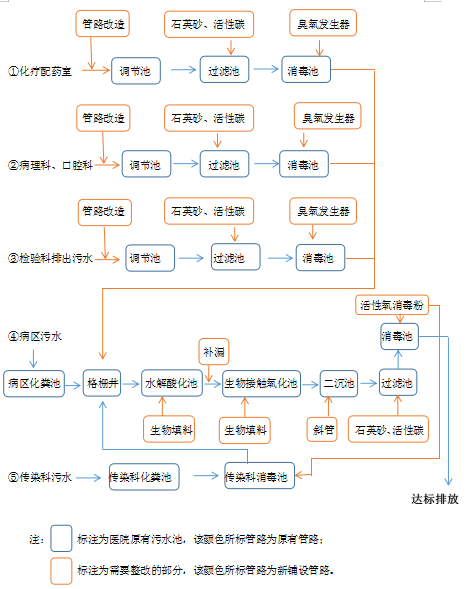 經(jīng)現(xiàn)場勘目前醫(yī)院污水總量為日常為600-700 m3/d,夏季高峰期污水總量達(dá)到800-900m3/d,醫(yī)院污水有五個(gè)排入口,第一個(gè)是化療科配藥室污水經(jīng)預(yù)處理排入醫(yī)院污水站;第二個(gè)是病理科、口腔科污水經(jīng)經(jīng)預(yù)處理排入醫(yī)院污水站;第三個(gè)是檢測科、輸血室污水經(jīng)預(yù)處理排入醫(yī)院污水站;第四個(gè)是傳染科污水經(jīng)預(yù)處理排入醫(yī)院污水站;第五個(gè)是病區(qū)污水的排入;五處污水都經(jīng)醫(yī)院污水站的處理工藝后排入市政管網(wǎng)。此五處污水工藝均存在部分問題,整改如下: