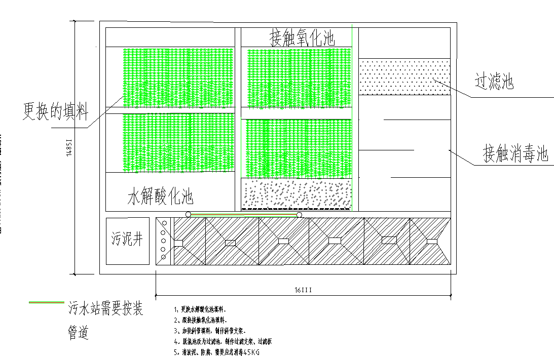 ⑤醫(yī)院污水站在水解酸化池與接觸氧化池之間池壁存在裂縫,需補(bǔ)漏;水解酸化池中填料需要更換;接觸氧化池中生物填料需更換;二沉池中需增加斜管,增加停留時(shí)間;原消毒池改為過濾池,增加石英砂、活性性;原脫氯池未正常使用,如消毒工藝改為活性氧消毒粉消毒,則可把脫氯池改為消毒池,用原有消毒劑投加設(shè)備向消毒池內(nèi)投加活性氧消毒粉。因消毒使用原有設(shè)備密封性不好,建議使用純活性氧消毒粉。