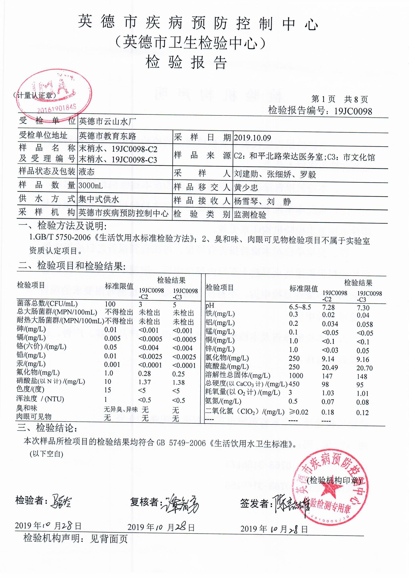 5.本月公布2019年10月份英德市云山水廠出廠水常規(guī)45項(xiàng)指標(biāo)檢測(cè)結(jié)果和管網(wǎng)水水質(zhì)情況與檢測(cè)結(jié)果。