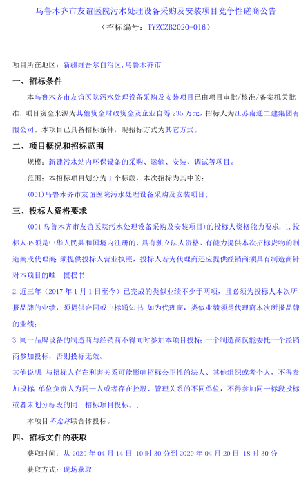 烏魯木齊市友誼醫院污水處理設備采購及安裝項目競爭性磋商公告