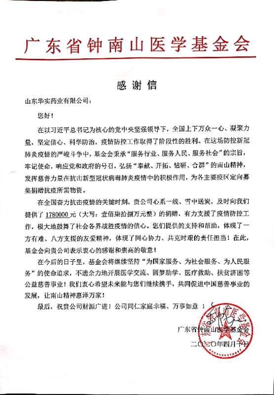 來(lái)自廣東省鐘南山醫(yī)學(xué)基金會(huì)的一封感謝信-致山東華實(shí)藥業(yè)有限公司
