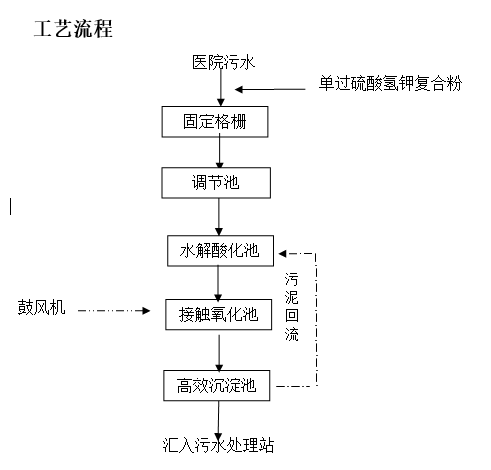 處理工藝:“固定格柵+調(diào)節(jié)池+水解酸化池+接觸氧化池+高效沉淀池+匯入污水處理站”。