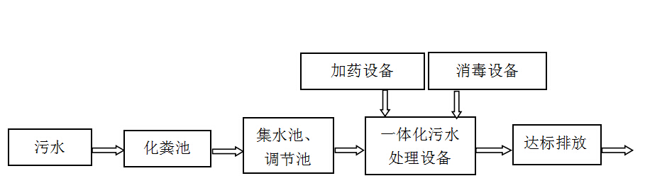 該站污水在化糞池匯集、厭氧消化后經格柵去除水中的大中型固體懸浮物。格柵池出水流入調節池,在調節池中安裝污水泵將污水泵入接觸氧化池,通過鼓風機曝氣使污水與生物膜和活性污泥充分接觸,通過好氧細菌降解有機污染物質;曝氣池出水進入沉淀池,利用重力沉淀分離曝氣產生的活性污泥;上層清液污水泵進入消毒池,通過混合工藝使污水與二氧化氯消毒劑在池中混合,殺滅菌體;消毒后的污水,經水質監測合格排入城市管網或自然水體。