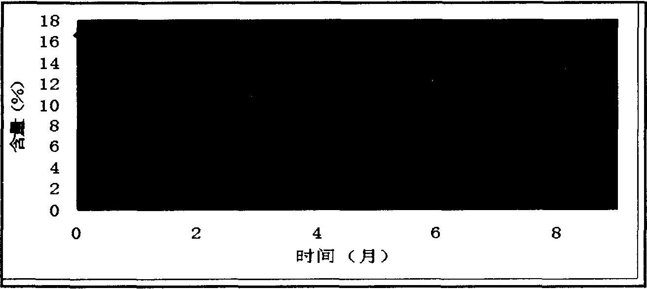 將一定量物質(zhì)A溶解在120.0ml水溶液中,加入24.0 ml重量百分濃度為30%過氧化氫,加入微量其他穩(wěn)定助劑,搖勻后,作為吸收液吸收二氧化氯,待吸收液變?yōu)槟z狀,在70℃烘干,密封保存。固體二氧化氯長(zhǎng)期存放有效二氧化氯變化圖: