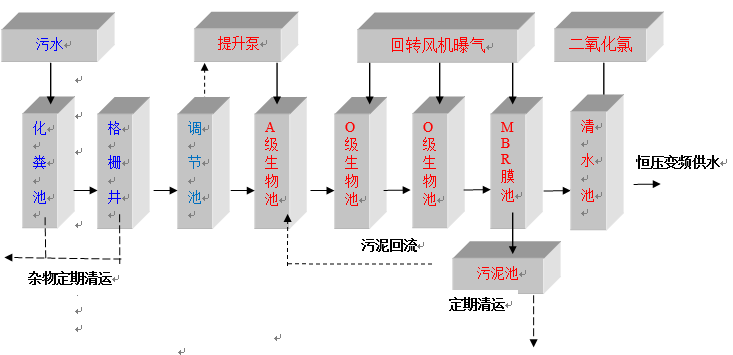 污水由排水系統收集后,進入污水處理站的格柵井,去除顆粒雜物后,進入調節池,進行均質均量,調節池中設置液位控制器,再經液位控制儀傳遞信號,由提升泵送至A級生物接觸氧化池,進行酸化水解和硝化反硝化,降低有機物濃度,去除部分氨氮,然后入流O級生物接觸氧化池進行好氧生化反應,O級生物池分為兩級,在此絕大部分有機污染物通過生物氧化、吸附得以降解,然后經過二沉池進行固液分離,MBR膜過濾后上清液經二氧化氯消毒后回用或排放。