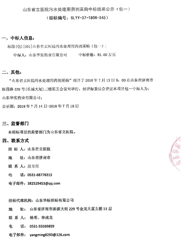 山東省立醫(yī)院污水處理用藥劑采購中標(biāo)結(jié)果公示(包一)