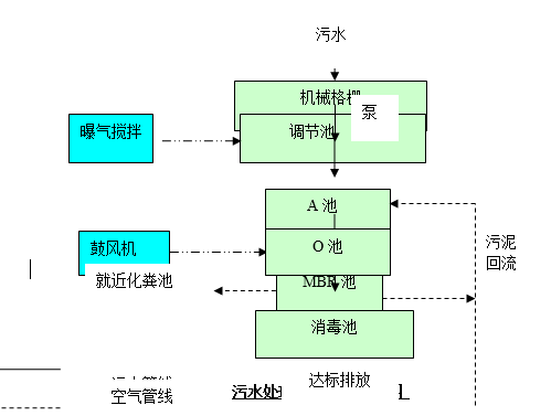 經過化糞池預處理后的各排污點污水,通過污水管網收集后進入格柵渠,經過機械格柵將水中的漂浮物、懸浮物攔截去除后進入曝氣調節池,再通過污水提升泵將調節后的水打至缺氧池,然后自流入好氧池(O池),污水中的CODcr、BOD5在好氧池中被分解為水和二氧化碳,氨氮被氧化為亞硝態氮、硝態氮。經過好氧曝氣和生物處理后的水,由泵通過濾膜過濾后抽出。由于膜的存在大大提高了系統固液分離的能力,從而使系統出水水質和容積負荷都得到大幅度提高。