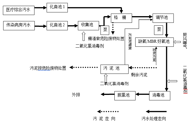 主要作用:單獨收集傳染病房污水并消毒,污水經過消毒后,再泵入調節池。