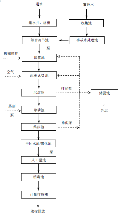 污水由收集管網自流至集水井內,集水井內設格柵,去除大部分較大的懸 浮或漂浮物,防止堵塞管道及設備,影響后續設備運行。集水井內設提升泵,污水由提升泵提升至綜合調節池,均化水質、調節水量后由調節池內的提升泵提 升至集成設備,經該系統處理后廢水進入臭氧氧化池,進一步去除有機污染物, 后自流經紫外消毒器,消毒后進入計量槽后達標排放。